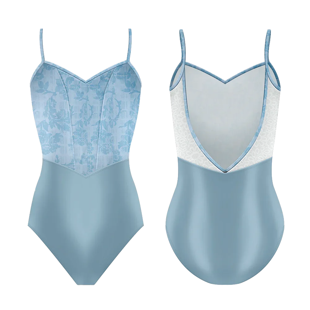 The front of Chanelle is constructed with Danse de Paris' signature bodice paneling with French princess seams that shape the bodice, and an elegant V-front neckline. The mid-section V draws the line of the leotard in, focusing on the narrowest part of the waist.