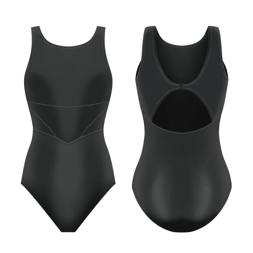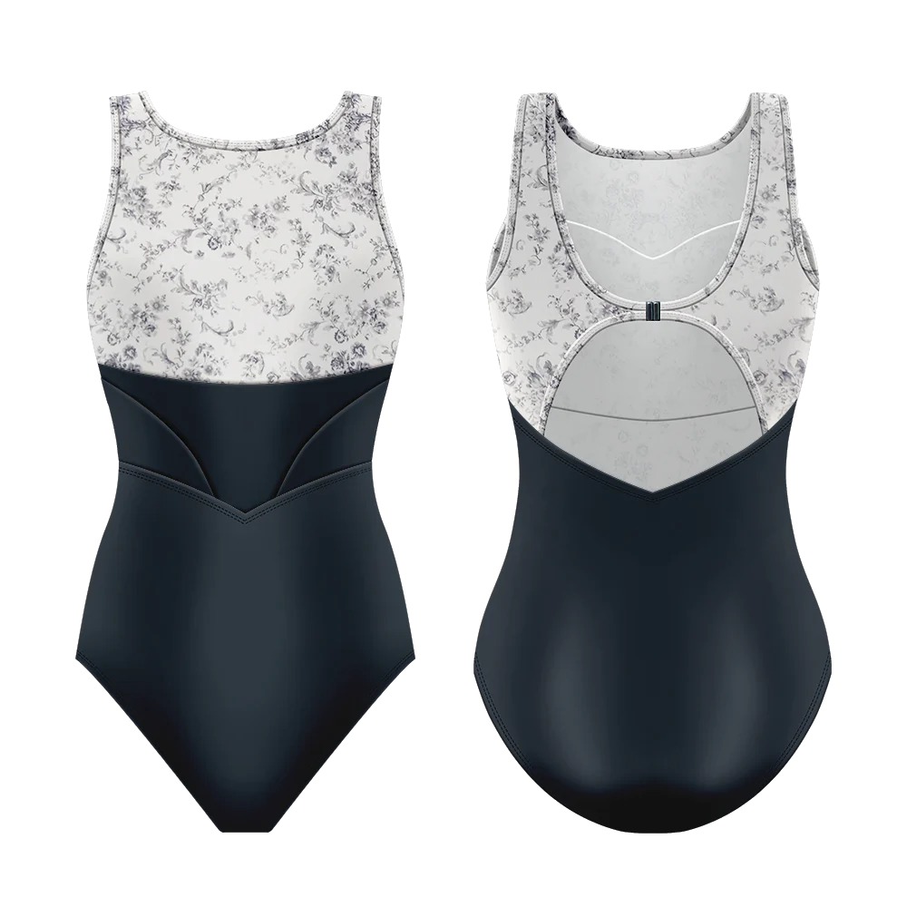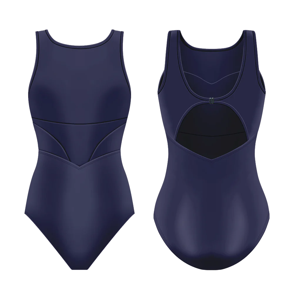 The front of Blisse is constructed with Danse de Paris' signature bodice paneling, as well as innovative bust support technology for extra comfort. Also part of the design is an elegant curved high neck, as well as a mid-section V panel; this draws the line of the leotard in, focusing on the narrowest part of the body, and resembles the structure of a corset.