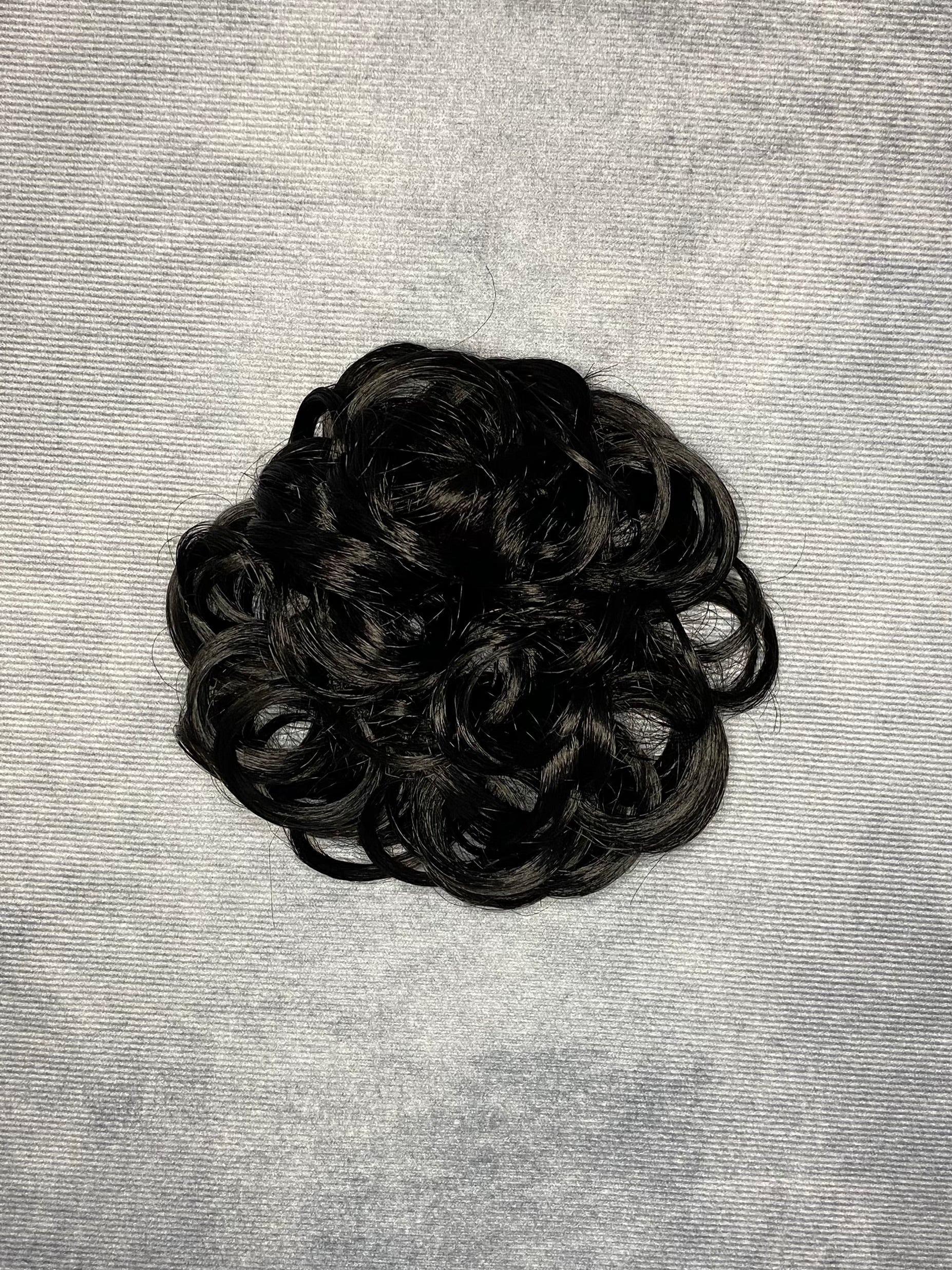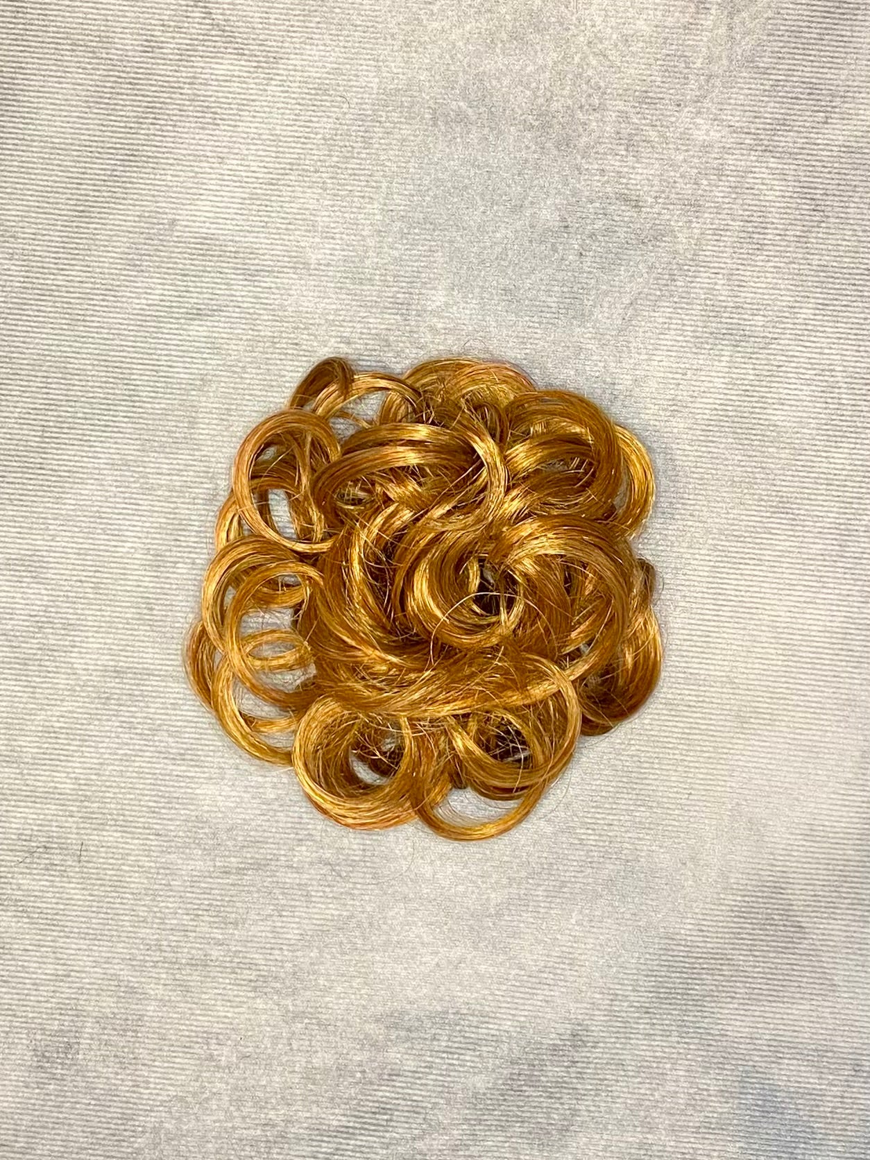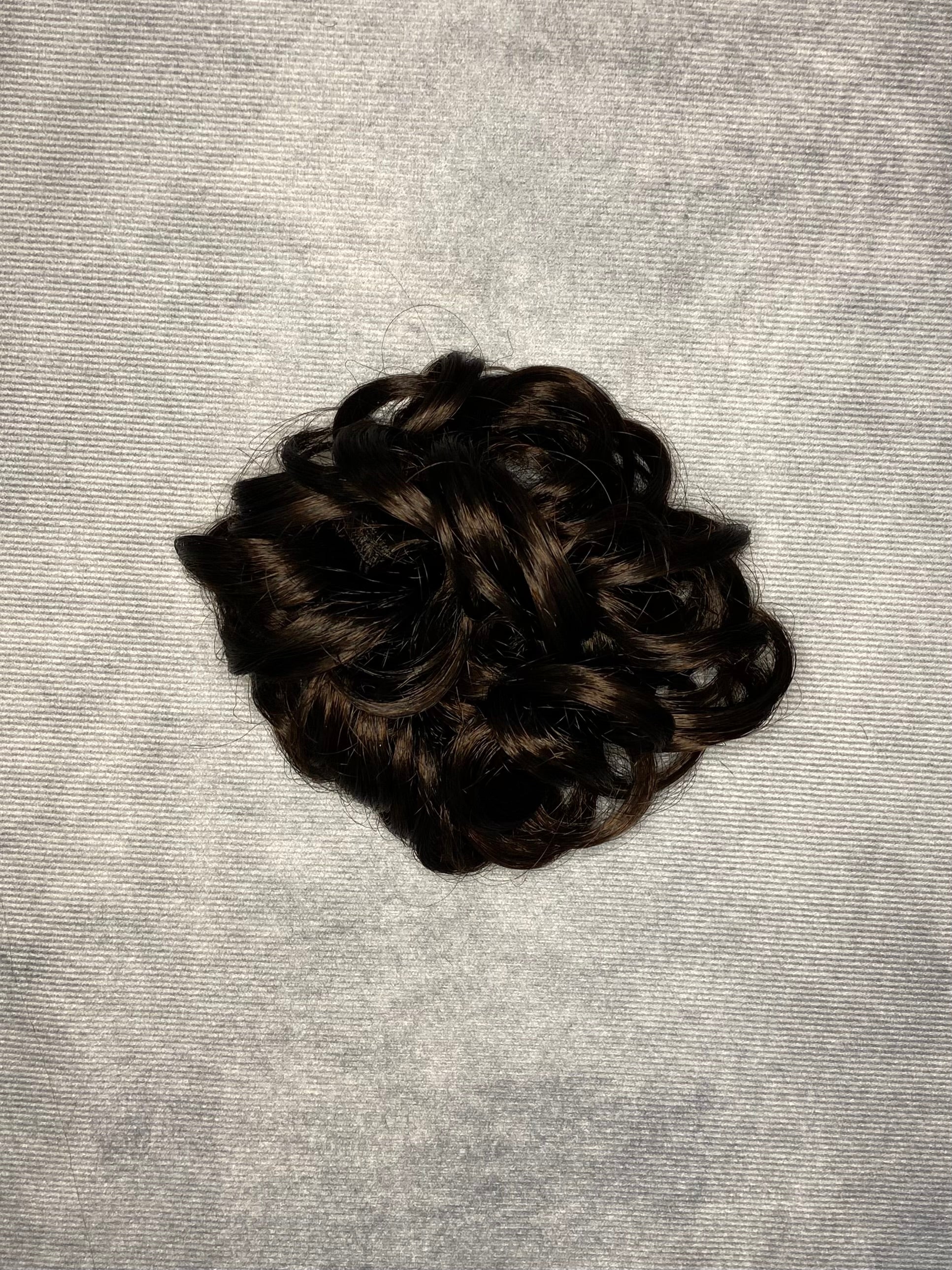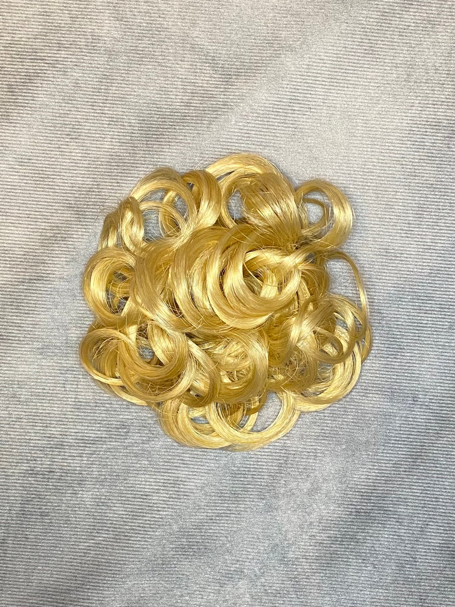 Short curls of hair on an elastic. Easy to attach over a bun for dance competitions or everyday wear.