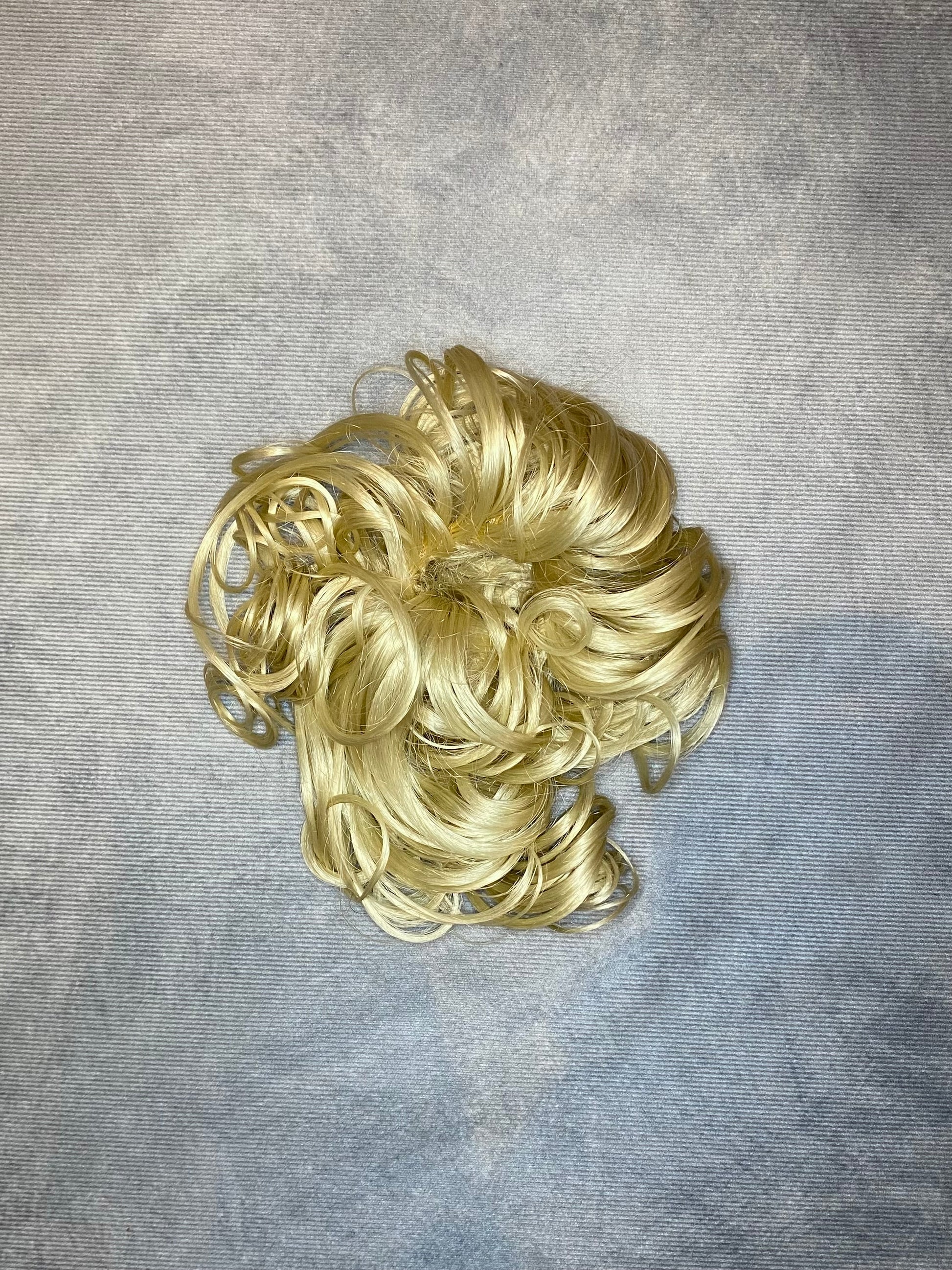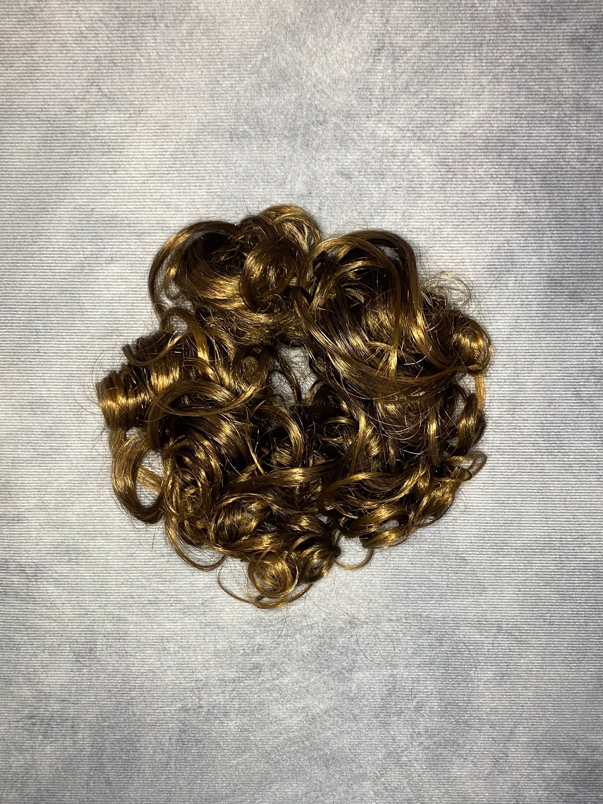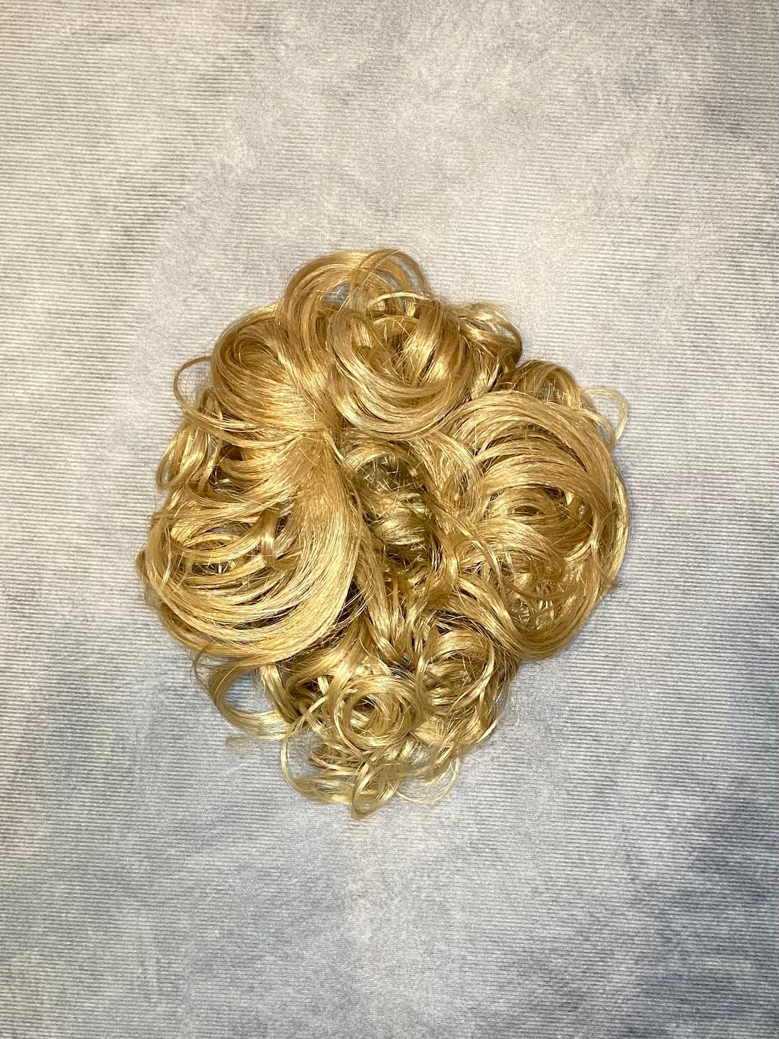 Long curls of hair on an elastic. Easy to attach over a bun or ponytail for dance competitions or everyday wear.