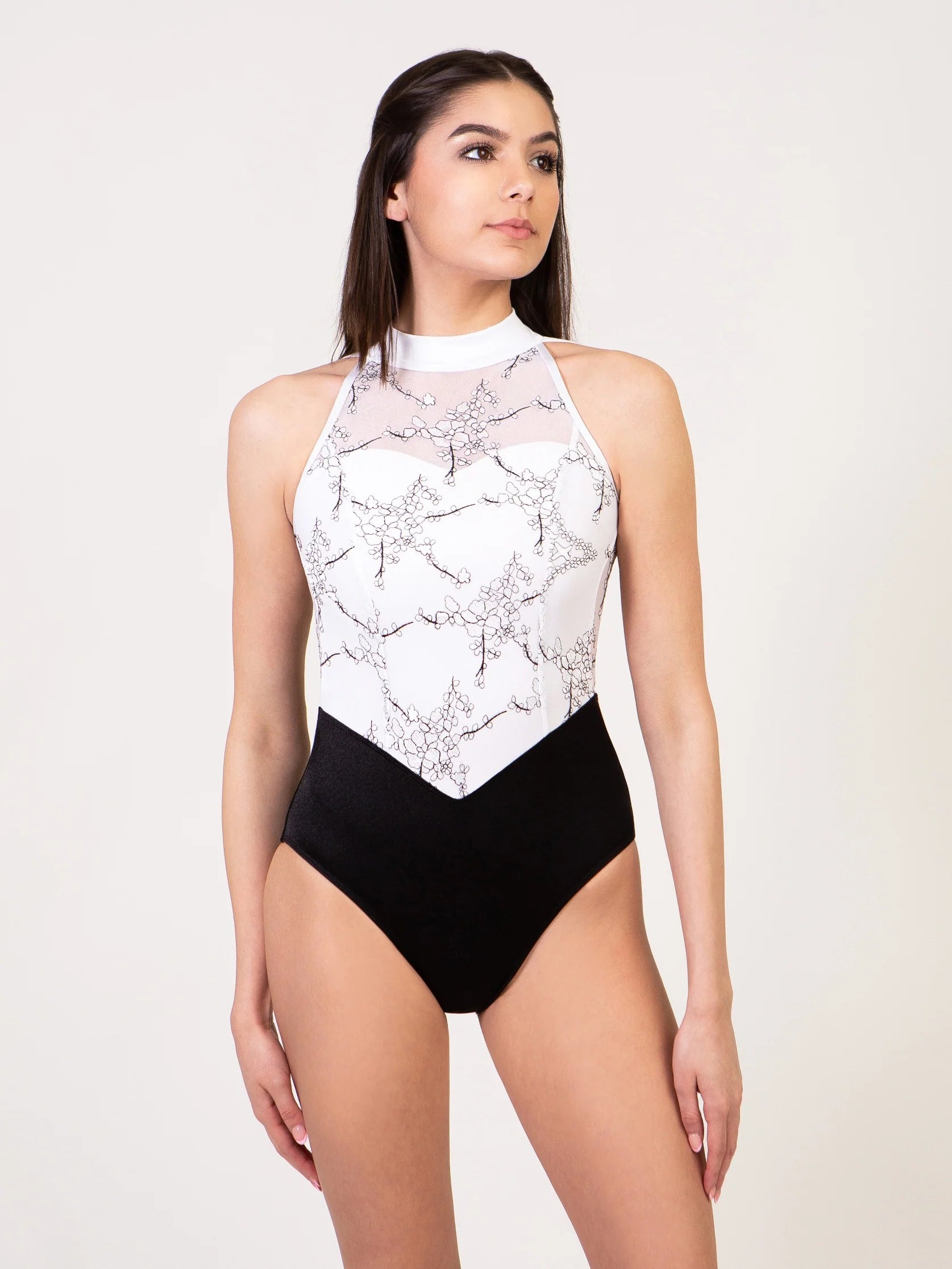 Sweetheart high neck leotard with embroidered mesh overlay, princess seams, and V waist.